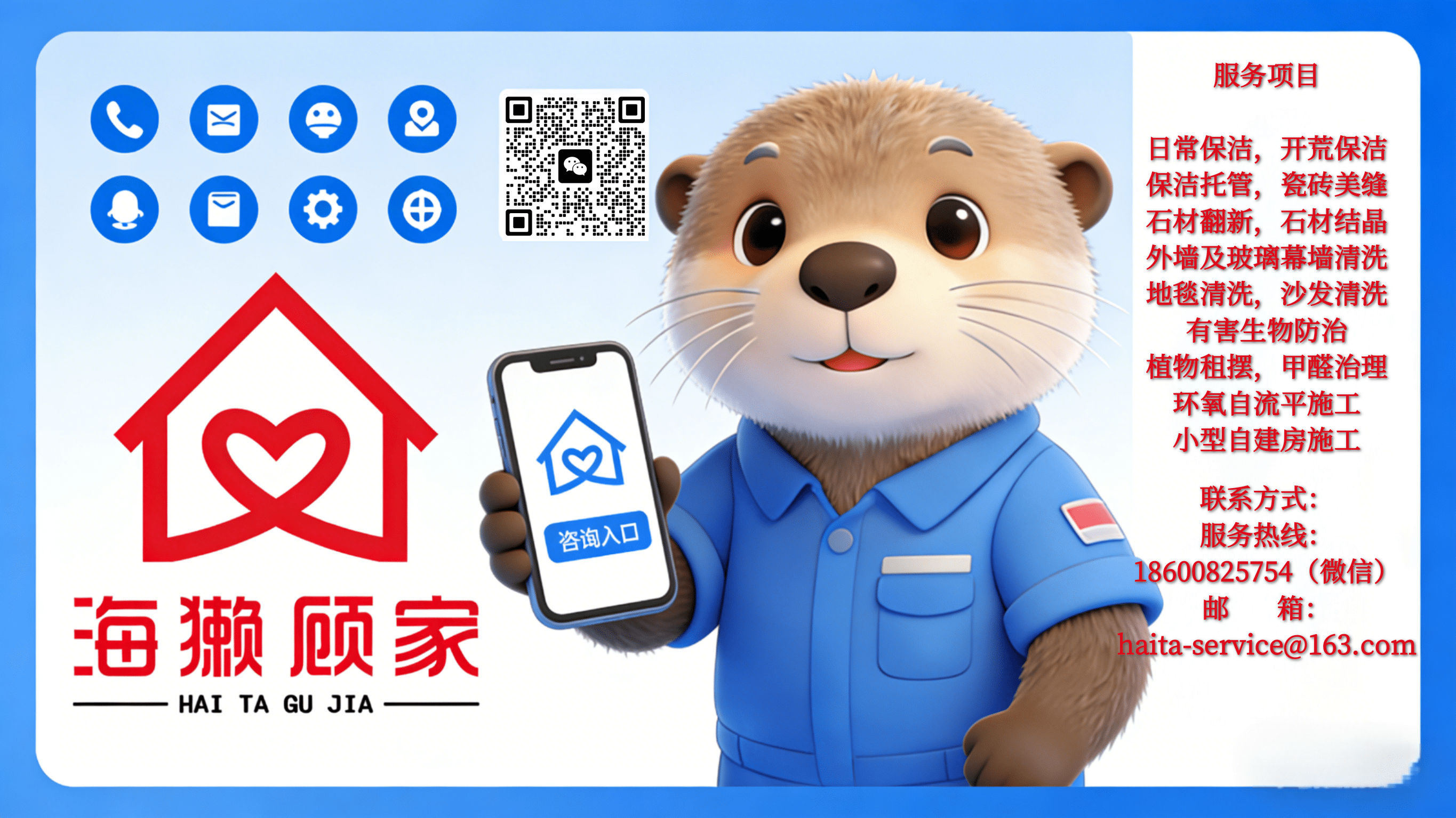 2019年公司形象全线升级,借以“海獭 ” 清洁,专注,爱家的形象为依托。打造“爱工作,爱家庭,爱生活”的服务理念。并始终奉行“诚信经营,”的原则,严格遵照质量认证体系标准,为客户提供高品质的清洁服务。